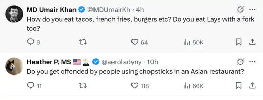 एक यूजर ने तंज कसते हुए पूछा, क्या आप एशियाई रेस्टोरेंट में चॉपस्टिक से खाने पर भी नाराज होते हैं? दूसरे ने लिखा, टैको, फ्रेंच फ्राइज और बर्गर आप कैसे खाते हैं? क्या चिप्स भी कांटे से खाते हैं? एक और यूजर ने कहा, आप उनकी नीतियों की आलोचना नहीं कर पा रहे, इसलिए अब उनकी संस्कृति पर निजी हमला कर रहे हैं।